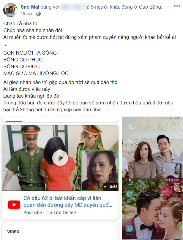 Mới đây, trên trang facebook cá nhân, chị Thu Sao vừa đăng tải bài viết bày tỏ sự bức xúc với một số thông tin gây ảnh hưởng nghiêm trọng đến danh dự, cuộc sống của chị. Cụ thể, trên Youtube xuất hiện đoạn clip cắt ghép hình ảnh của chị Thu Sao cùng tiêu đề gây chú ý: “Cô dâu 62 tuổi bị bắt khẩn cấp vì liên quan đến đường dây mại dâm xuyên quốc gia” kèm theo đó là hình ảnh của chị Thu Sao phía góc phải màn hình Youtube.