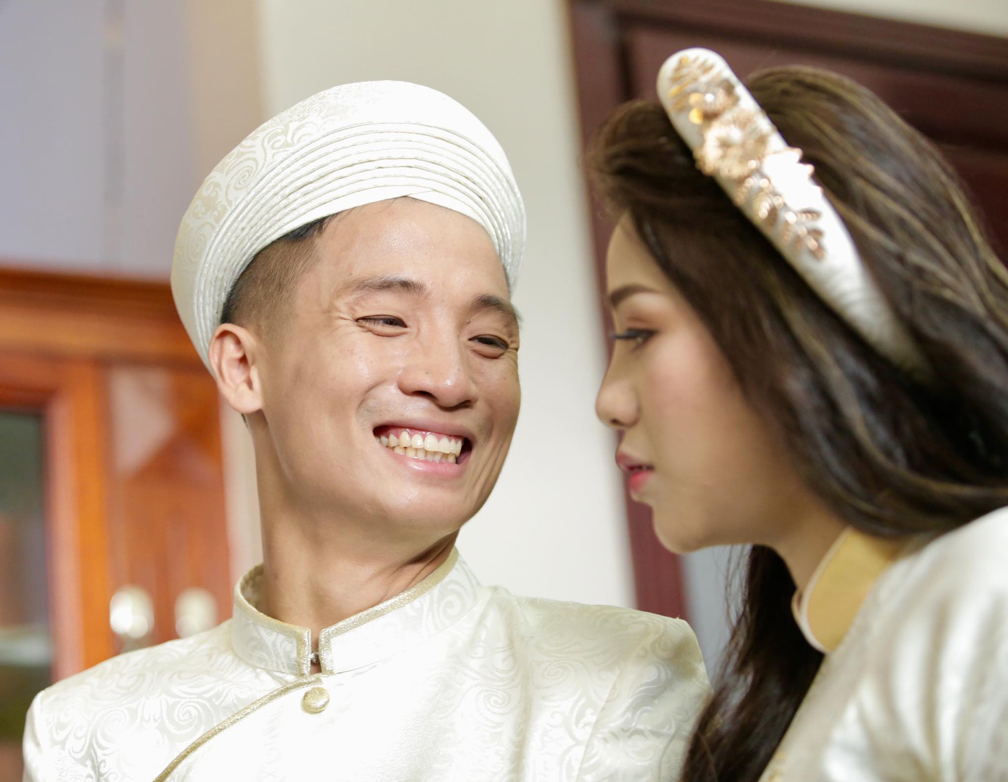 Bùi Tiến Dũng rất ân cần chăm sóc cô dâu.