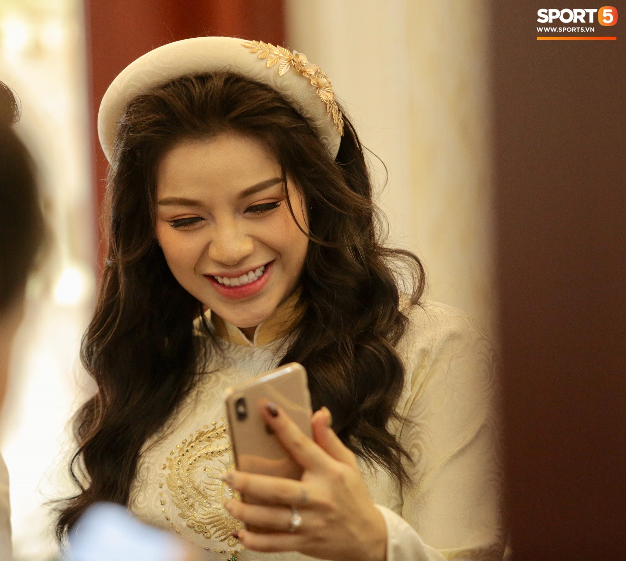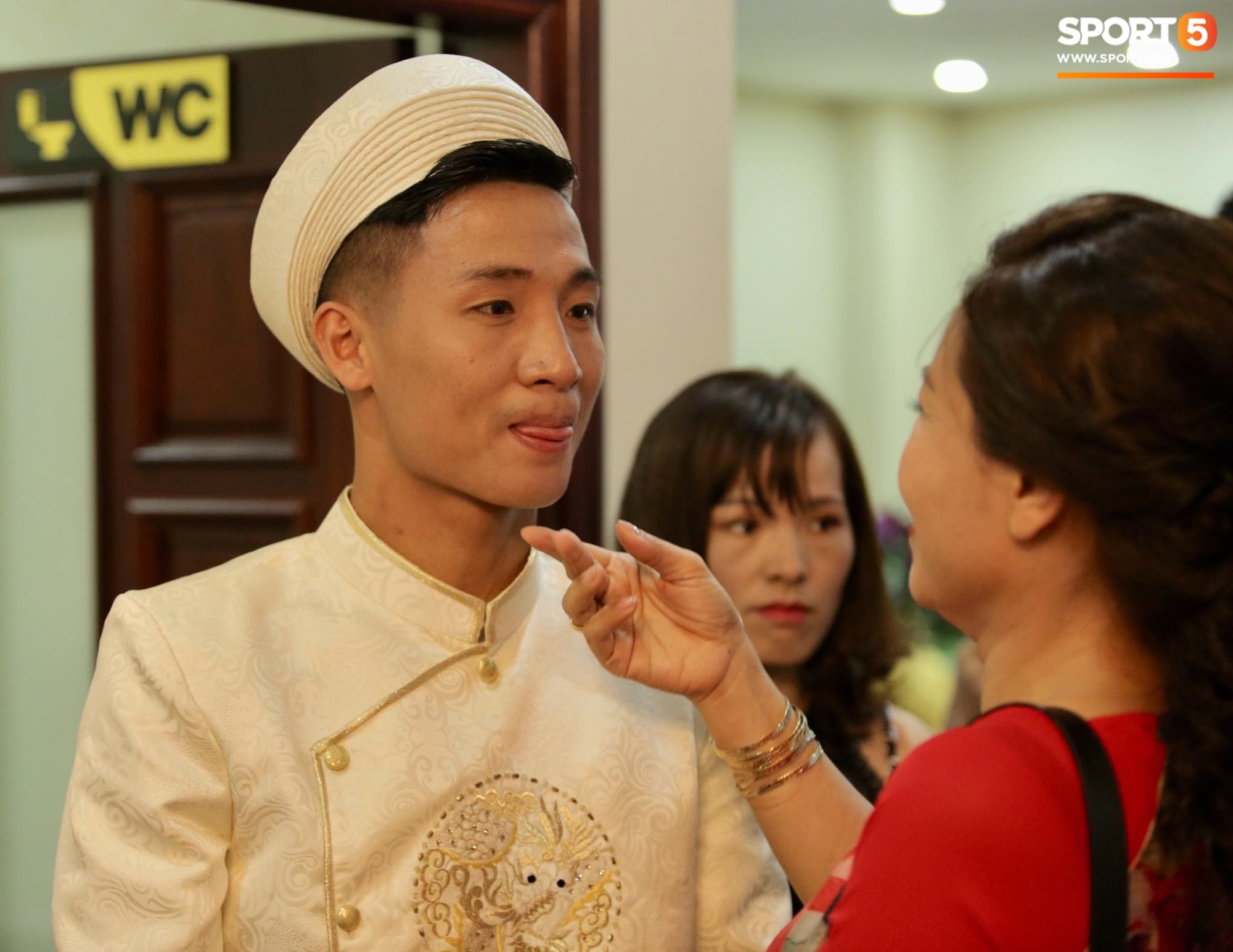 Trước giờ tổ chức ăn hỏi, trung vệ Viettel tỏ ra hồi hộp. Anh diện bộ áo dài truyền thống màu trắng và nhận được sự chăm sóc, sửa soạn của gia đình.