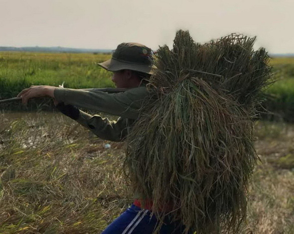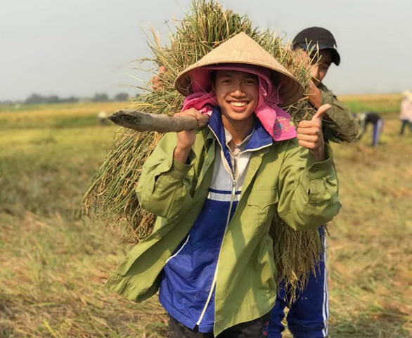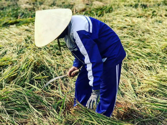 Đều xuất thân từ ruộng đồng nên gần như bạn nào cũng biết gặt lúa. Những bạn không gặt được thì ôm lúa lên bờ. Việc bó lúa thì có một số phụ huynh trợ giúp. Ông Nguyễn Văn Lạc, cha của Tình, cười vui suốt.