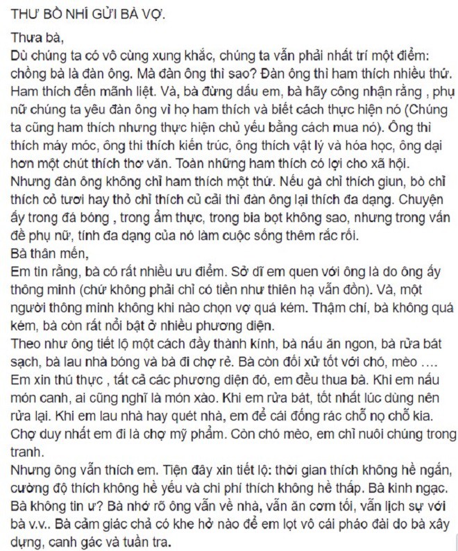 Bức thư đòi “trả” lại chồng cho các bà vợ một cách đầy hào sảng có tên “Thư bồ nhí gửi bà vợ”. Trong thư, dù cô bồ thừa nhận số ưu điểm của vợ cả đủ sức đánh bại cô ta, thế nhưng ngang ngược chốt lại bằng một câu: “Nhưng ông vẫn thích em”.