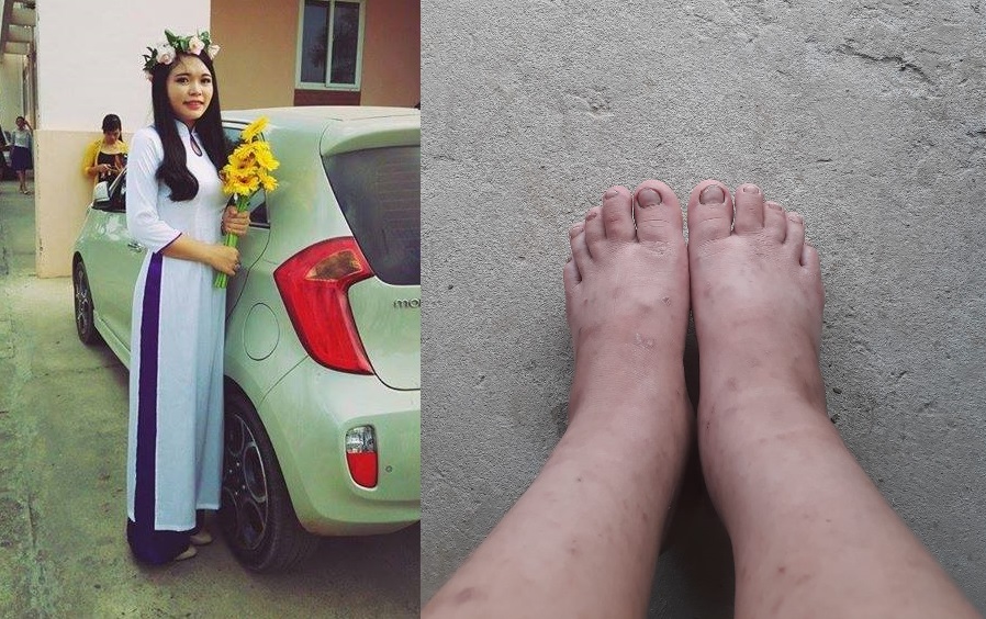Không chỉ thay đổi về vóc dáng, đôi chân của mẹ Minh Mỡ còn bị phù và có dấu hiệu nổi mẩn ngứa.