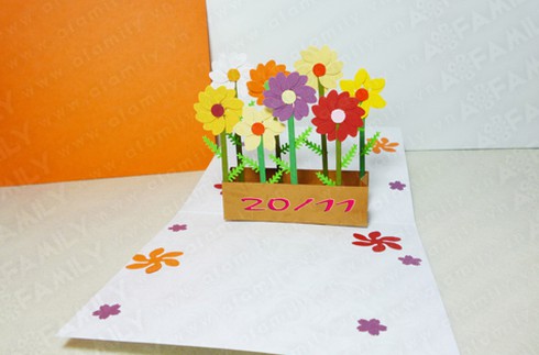 Bước 5: Dán tất cả những bông hoa đã làm ở bước 2 vào hai bên chậu cây là bạn đã có được một chiếc thiệp 3D rồi.