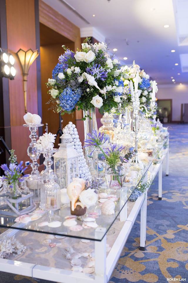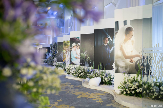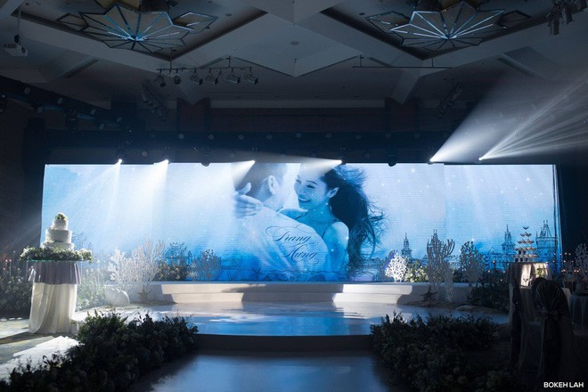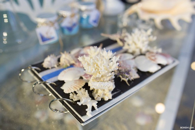Có lẽ vì mang biệt danh ”Cá mập”, nên đám cưới của Shark Hưng được mô phỏng như một đại dương thu nhỏ. Tất cả mọi thứ - từ thiệp cưới, giày cưới, váy cưới… cho đến phụ kiện - đều mang màu sắc chủ đạo là xanh dương và trắng. Điểm xuyết thêm là những vật dụng thân quen với biển cả như vỏ sò, vỏ ốc…