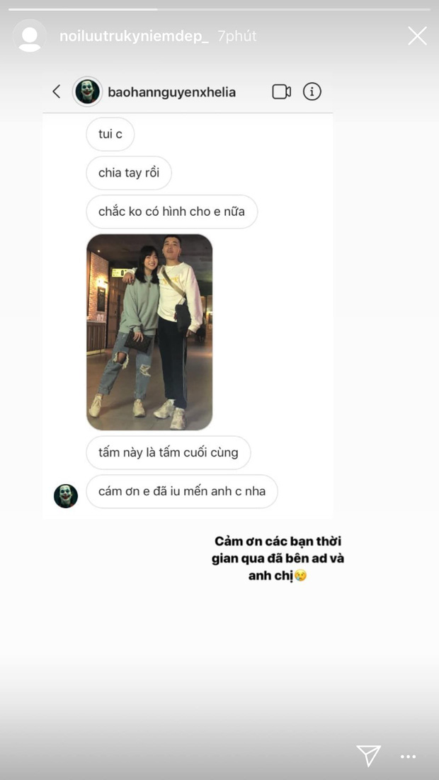 Cụ thể, mới đây trên fanpage của cặp đôi đã đăng tải hình ảnh loạt tin nhắn được chính Bảo Hân xác nhận với fan cả hai đã “đường ai nấy đi” sau 4 tháng hẹn hò. “Tụi chị chia tay rồi. Chắc không còn hình cho em nữa… Cảm ơn em đã yêu mến anh chị nha”, cô nàng trả lời với người hâm mộ.