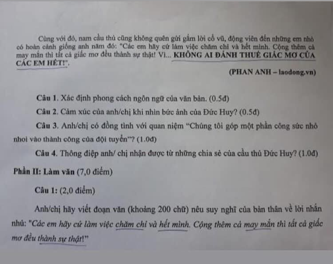 Mới đây, trên trang cá nhân, tiền vệ Đức Huy của ĐTVN đã chia sẻ đề thi môn Ngữ văn lớp 12 của trường THPT Phan Ngọc Hiển (Cà Mau). Trong đó, câu chuyện của anh từ một cậu bé nhặt bóng đến cầu thủ góp công trong chức vô địch Đông Nam Á đã được nhắc đến.