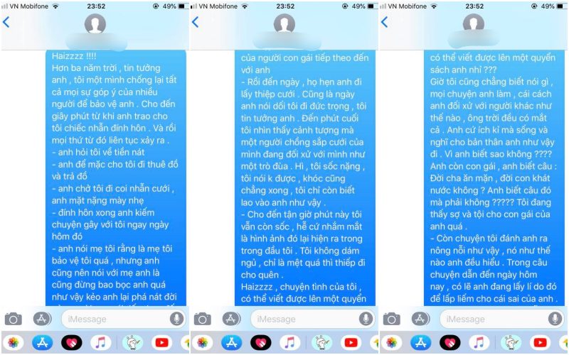 Trên Facebook của cô chị gái, người này cũng đăng tải một số đoạn tin nhắn được cho là nhắn với cô người yêu cũ của chồng sắp cưới với những lời lẽ đau lòng, tố qua tố lại. Cô cũng phân bày chuyện đánh chồng sắp cưới vì phát hiện người này đi Karaoke ôm tới sáng.