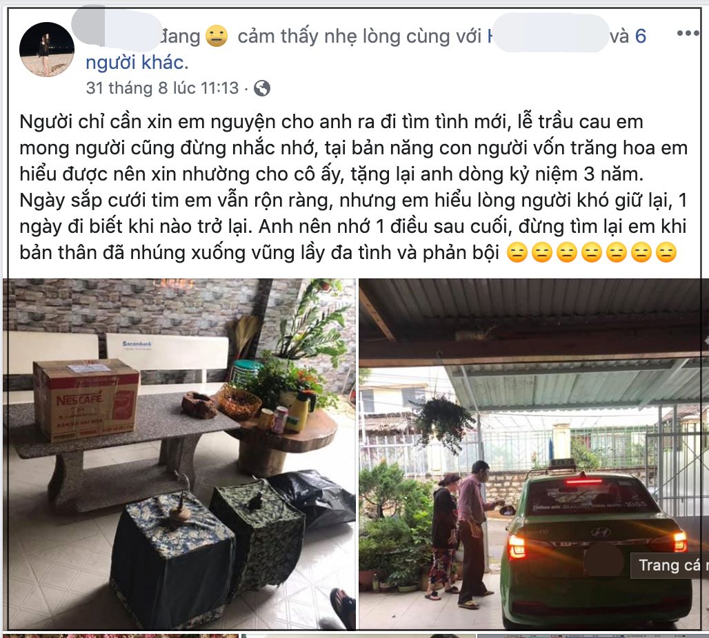 Đi kèm với bài viết là ảnh gia đình cô gái này dọn dẹp đồ đạc, sính lễ và hai lồng chim để trả lại cho chú rể. Cảnh tượng bố mẹ cô dâu đưa đồ lên taxi để trả lại nhà rể thật khiến nhiều người đau lòng.