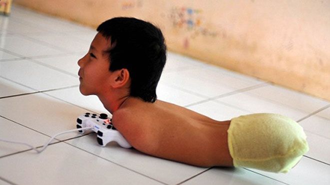 Thời gian rảnh rỗi, Tiyo thích chơi Playstation. Em sẽ dùng cằm để điều khiển trò chơi một cách thành thạo.
