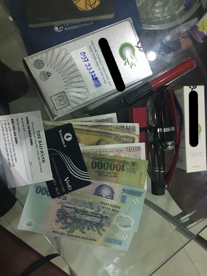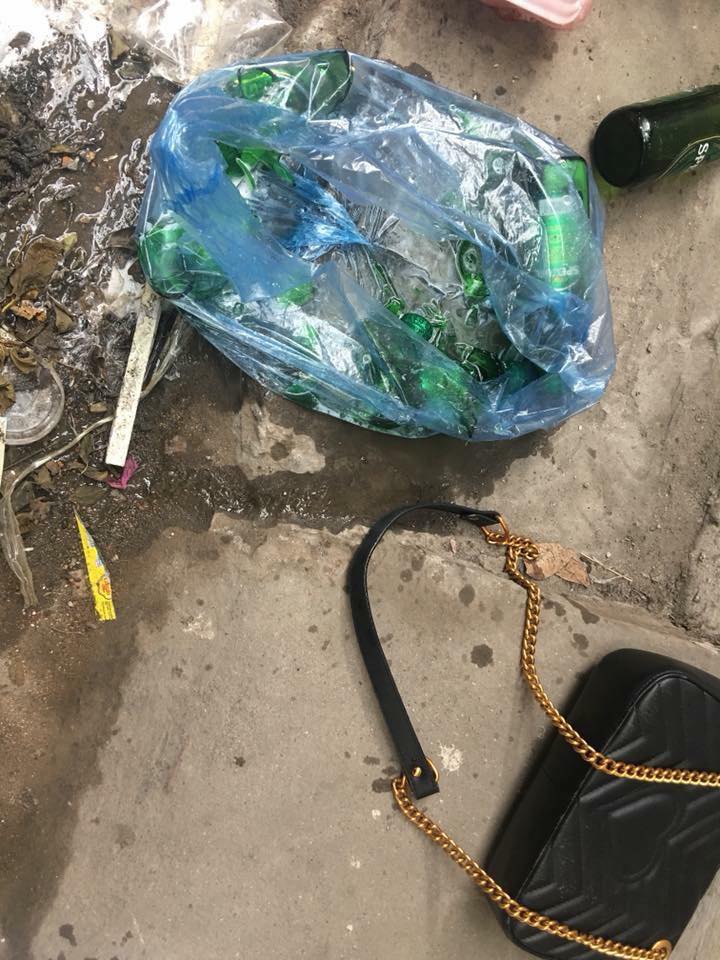 Vào đánh răng rửa mặt lúi húi mở cửa cuốn định hỏi xem thế nào thì chẳng thấy em ấy đâu nữa. Bia uống mấy chai đập vỡ tùm lum, bỏ lại túi xách. Trong đó có kính, mấy cây son, tiền mặt, thẻ bảo hành đồng hồ, thẻ khách hàng… và hai hộp thuốc có ghi số điện thoại nhưng rất tiếc bị bia bắn vào nên mờ.