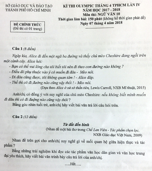 Đề môn Ngữ văn lớp 10, kỳ thi Olympic truyền thống 30/4 tổ chức tại TP HCM có câu hỏi được nhiều giáo viên nhận xét thú vị với đoạn trích trong truyện “Alice ở xứ sở thần tiên” của Lewis Carroll.