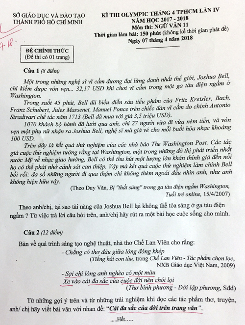 Ở khối 11, đề Văn có câu hỏi về tình huống nghệ sĩ dương cầm đương đại lừng danh Joshua Bell. Ông chỉ kiếm được hơn 32 USD khi chơi vĩ cầm tại ga tàu điện ngầm ở Washington khi làm một '”thí nghiệm”. Trong khi ở nhà hát, các buổi biểu diễn của ông luôn chật kín khán phòng.