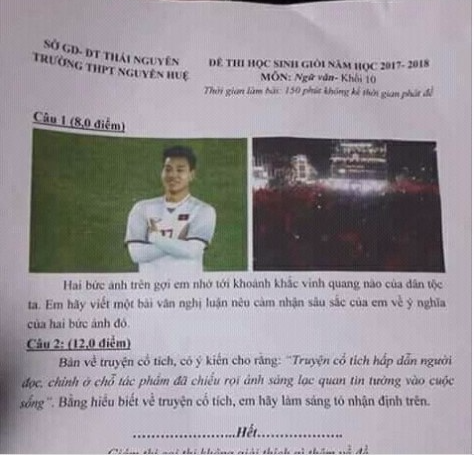 Trước đó, hình ảnh cầu thủ Văn Thanh khoanh tay sau cú sút penalty đưa Việt Nam vào VCK U23 châu Á đã được đưa vào đề thi HSG môn Ngữ văn lớp 10 tại Trường THPT Nguyễn Huệ (huyện Đại Từ, Thái Nguyên).