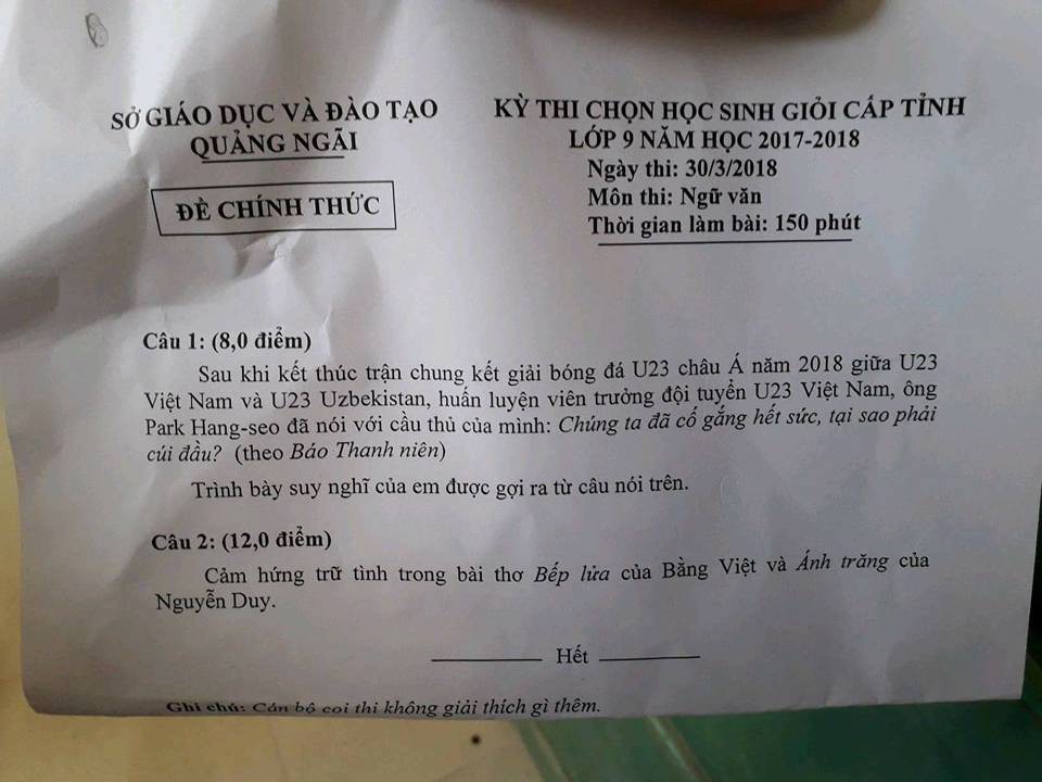 Có lẽ dư âm chiến thắng và trên hết là tinh thần chiến đấu vì tập thể, vì đất nước của tuyển U23 Việt Nam vẫn chưa dứt. Với những nhà giáo tâm huyết, có sự nhạy bén thì việc lựa chọn sự kiện lịch sử này cho vào đề thi là rất phù hợp. Vừa khiến học sinh hào hứng, thích thú khi làm bài lại vừa gửi gắm thông điệp về tình yêu nước, lòng tự hào dân tộc.