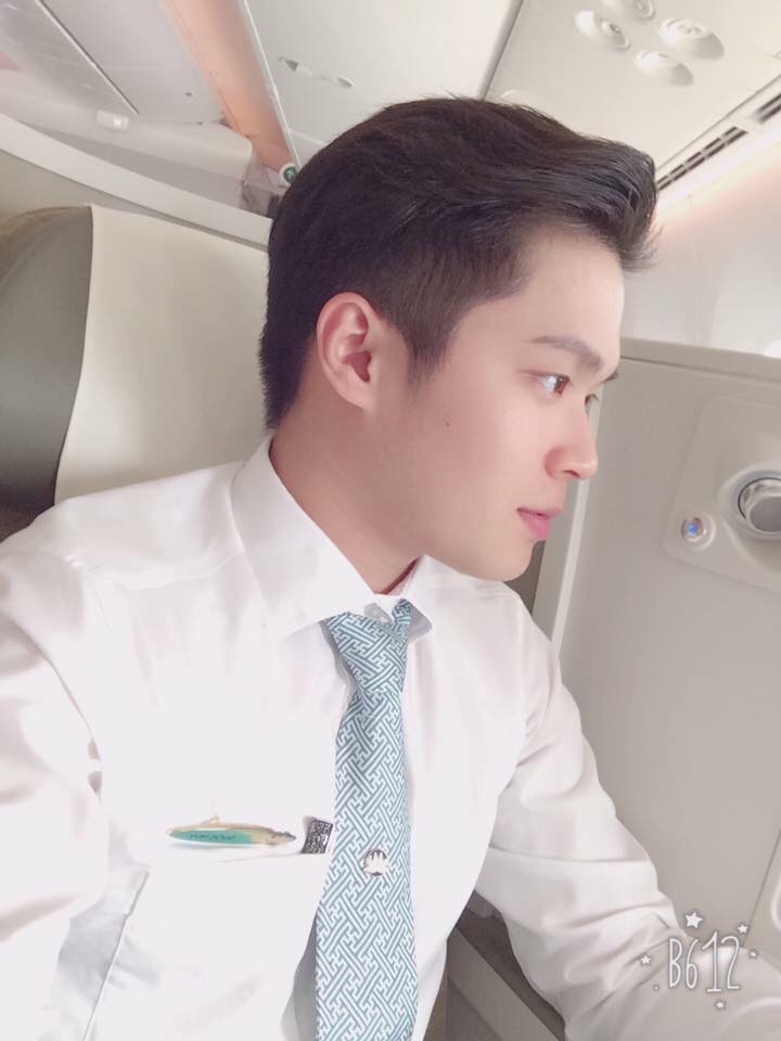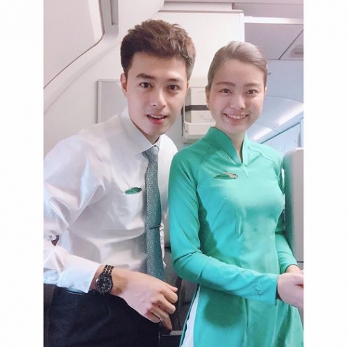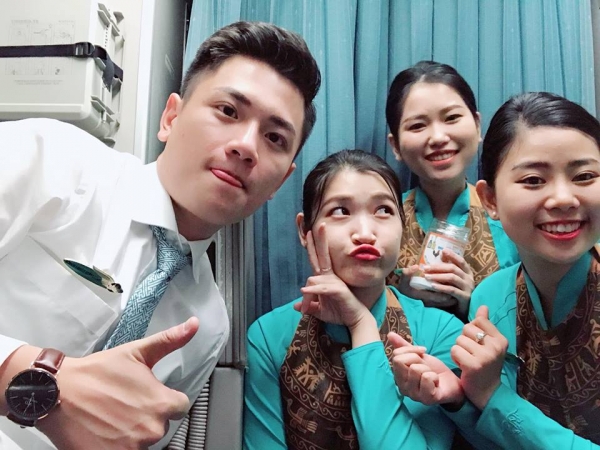 Bảo Trung chụp ảnh cùng đồng nghiệp trên một chuyến bay.