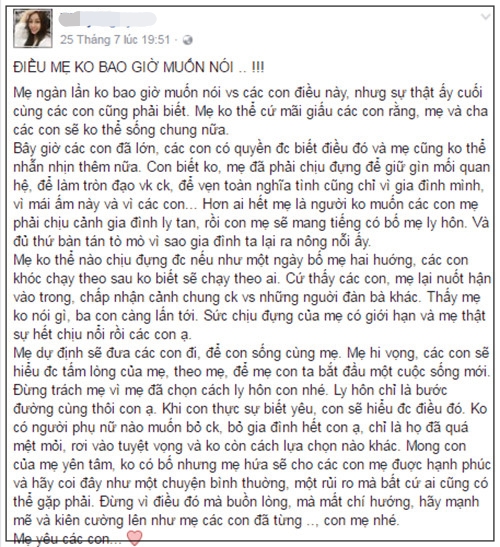 “Cứ thấy các con, mẹ lại nuốt hận vào trong, chấp nhận cảnh chung chồng với những người đàn bà khác. Thấy mẹ không nói gì, ba con càng lấn tới. Sức chịu đựng của mẹ có giới hạn và mẹ thật sự hết chịu nổi rồi các con ạ.