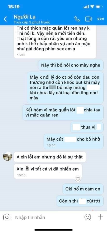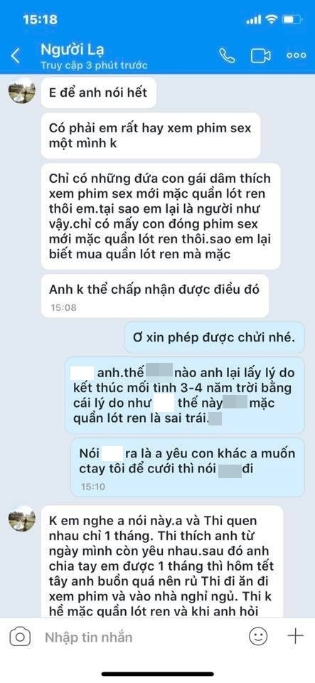 “Em có nhớ chuyến đi Đà Lạt trước khi mình chia tay không? Lúc em đi tắm, anh gom đồ vào vali thấy em mặc quần lót ren màu đỏ. Chỉ có những đứa con gái thích xem phim sex mới mặc quần lót ren thôi. Tại sao em lại là người như vậy? Chỉ có những đứa đóng phim sex mới mặc quần lót ren thôi, tại sao em lại biết mua quần lót ren mà mặc”.