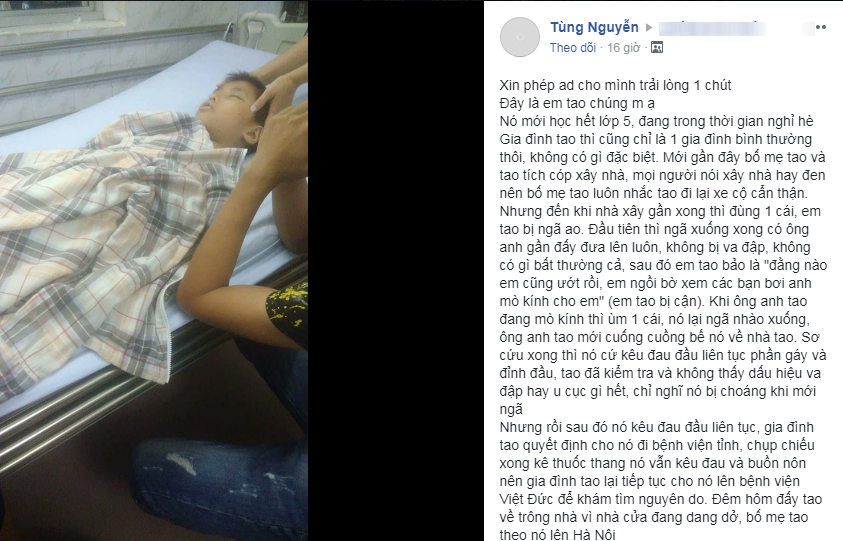Mới đây, trên một trang mạng xã hội, thành viên Tùng Nguyễn vừa mới chia sẻ câu chuyện của gia đình mình khiến nhiều người vô cùng xúc động. Theo đó, em trai của cậu bạn này bị ngã xuống ao 2 lần, qua những lần kiểm tra, gia đình đều không phát hiện điều gì bất thường. Tưởng chừng như không có gì nghiêm trọng, nhưng những ngày sau đó, cậu bé liên tục kêu đau đầu, buồn nôn nên gia đình đưa em đến bệnh viện và bàng hoàng nhận tin dữ khi bác sĩ thông báo em bị xuất huyết não.