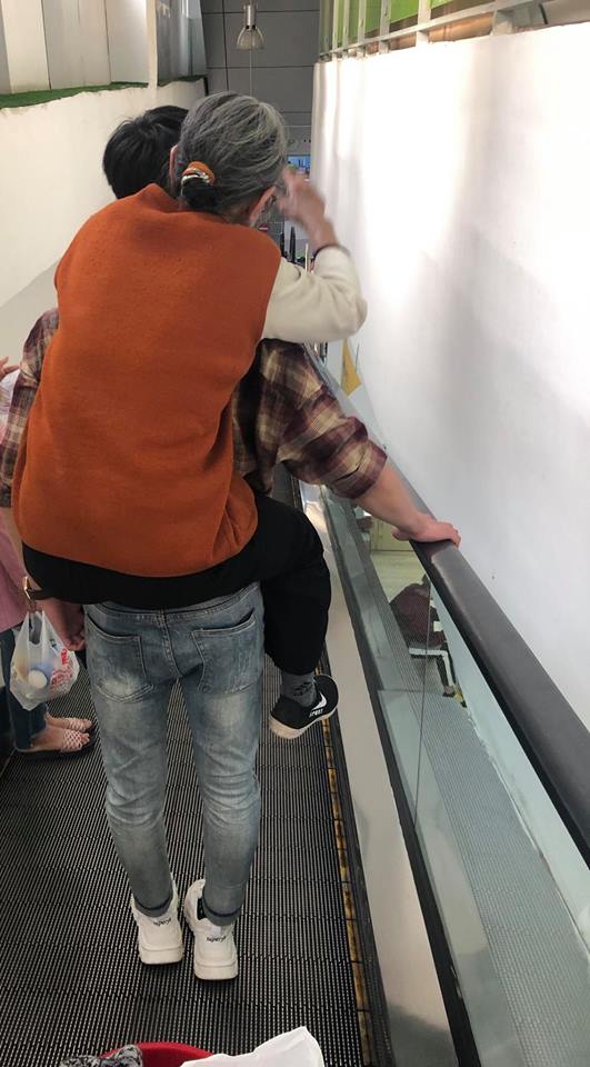 Cụ thể, bức ảnh chụp lại một chàng trai trẻ đang cõng người bà của mình xuống cầu thang máy tại một siêu thị gây xúc động. Theo người chia sẻ tấm hình, đây là siêu thị Big C và trước khi cõng bà, chàng trai còn hỏi “Bà sợ cầu thang máy à? Cháu cõng nhé?”