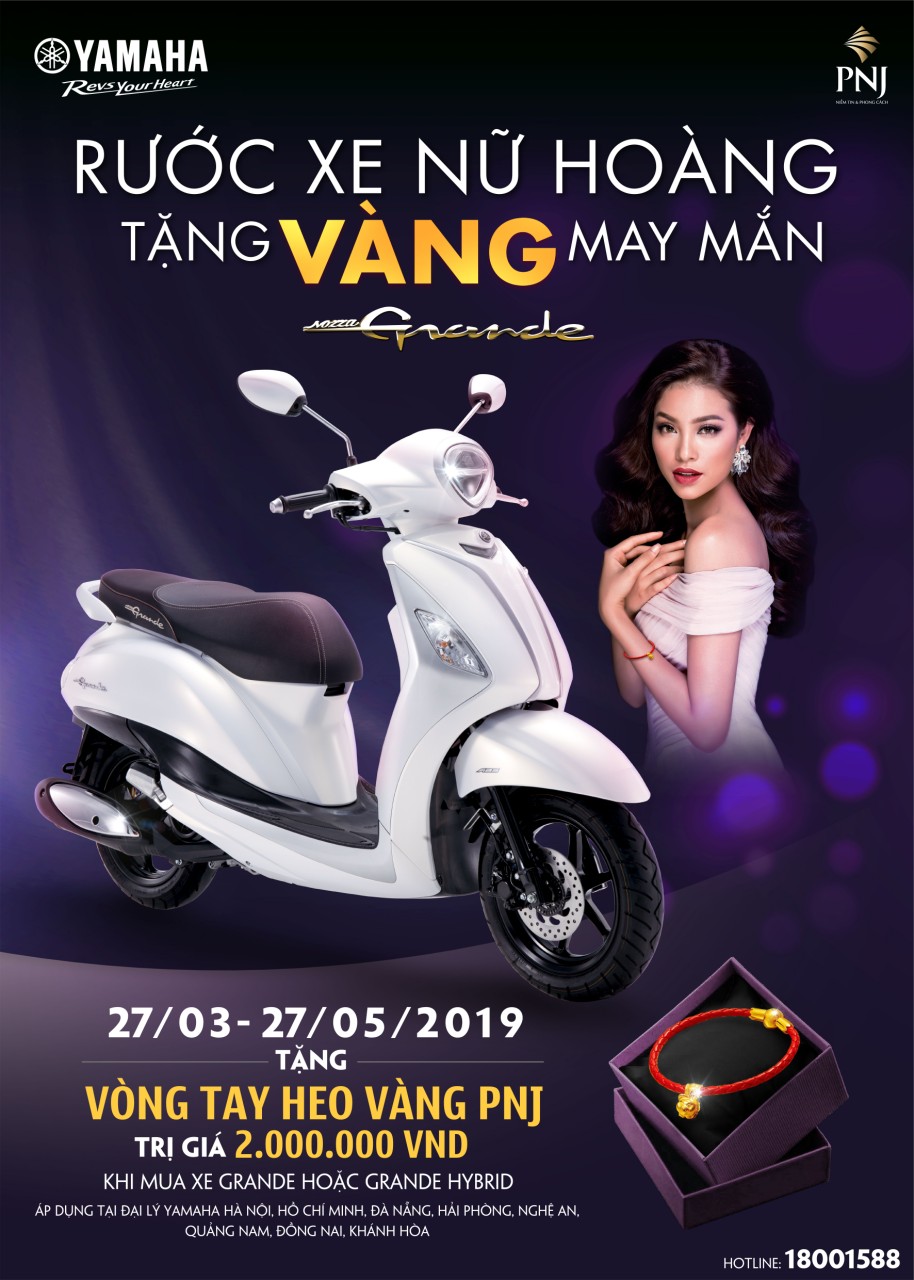Sở hữu kiểu dáng Châu Âu sang trọng và thanh lịch, động cơ tối ưu giúp xe chạy êm và tiết kiệm nhiên liệu, kể từ khi trình làng đến nay, xe ga Yamaha Grande đã trở thành mẫu xe được các cô nàng hiện đại, yêu thời trang và cá tính lựa chọn. Để đáp lại sự yêu mến đó của khách hàng, Yamaha Motor Việt Nam tung ra chương trình khuyến mãi mới nhất “Rước xe nữ hoàng, tặng vàng may mắn”.