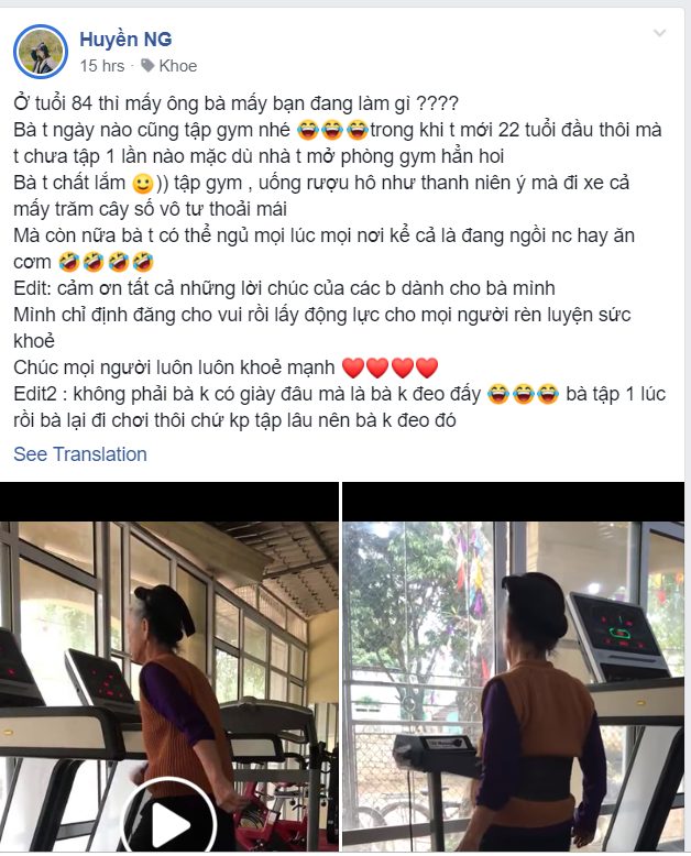 Đi kèm 2 đoạn clip, người đăng bài viết là cháu của cụ còn tâm sự: “Ở tuổi 84 thì mấy ông bà mấy bạn đang làm gì? Bà tôi ngày nào cũng tập gym nhé. Trong khi tôi mới 22 tuổi đầu thôi mà tôi chưa tập 1 lần nào mặc dù nhà tôi mở phòng gym hẳn hoi.
