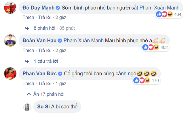 Cụ thể, Văn Hậu nhắn người anh mau bình phục, Duy Mạnh gọi anh “người sắt” trong khi Phan Văn Đức dù cũng bị đau nhưng không quên an ủi Xuân Mạnh.