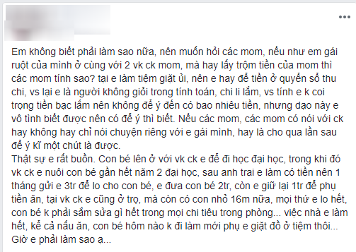 Câu chuyện của một người mẹ trẻ tâm sự trong diễn đàn hội nhóm dành cho các mẹ bỉm dưới đây khiến nhiều người bất ngờ: “Em không biết phải làm sao nữa, nên muốn hỏi các mom, nếu như em gái ruột của mình ở cùng với 2 vợ chồng mom, mà hay lấy trộm tiền của mom thì các mom tính sao?