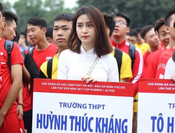 Cô nữ sinh dễ thương này tên là Trần Khánh Linh, sinh năm 2000, là học sinh trường THPT Huỳnh Thúc Kháng - Hà Nội. Ngày hôm đó, Khánh Linh đã đại diện nữ sinh trong trường tới cầm biển cho đội tuyển tham dự Lễ khai mạc Giải bóng đá học sinh các trường THPT Hà Nội.