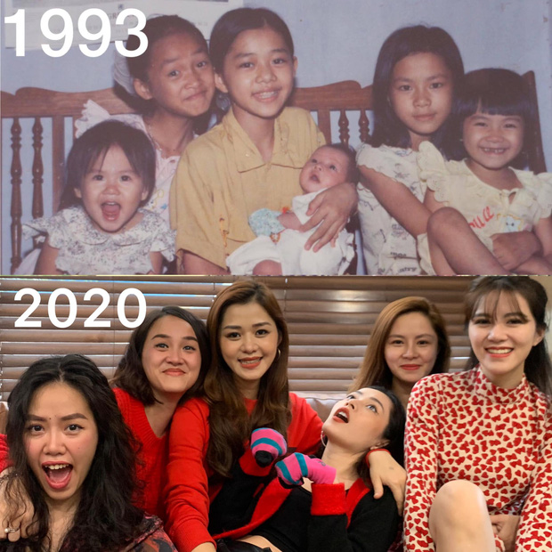 Trong những ngày đầu năm mới, thay vì nhìn lại một năm đã qua, Chi Pu “chơi trội” khi ôn lại kỷ niệm của 27 năm trước. Trên trang cá nhân, cô nàng đăng hai bức ảnh chụp 5 chị em trong dòng họ vào năm 1993 và năm 2020. Đặc biệt, các chị em nhà Chi Pu đều tạo dáng giống thời quá khứ.