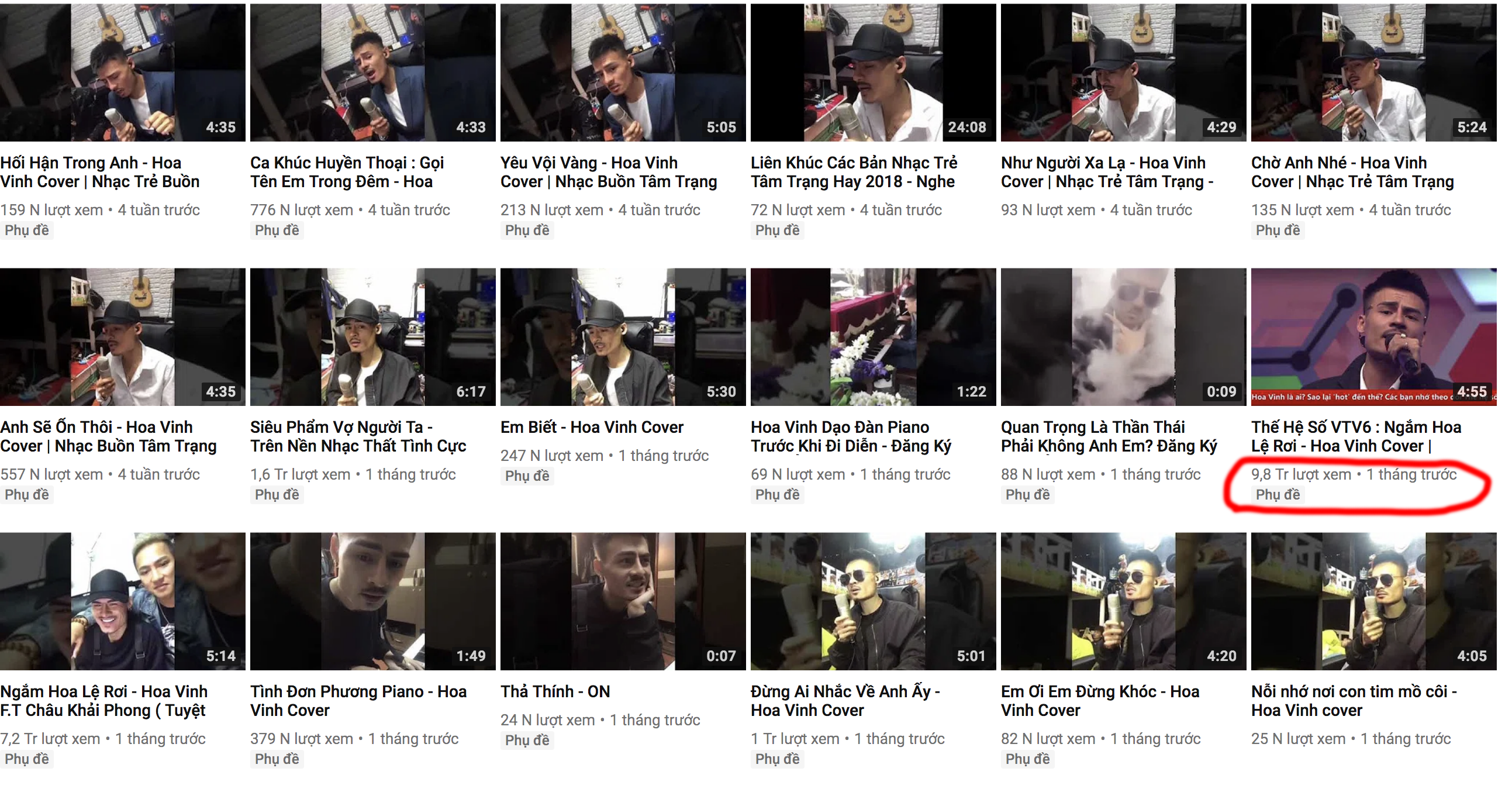 Có thể nói Hoa Vinh đang là cái tên ăn khách nhất hiện nay. Các clip của anh chàng cũng thu về trung bình từ 50k đến hơn 300k lượt xem cho mỗi clip. Riêng clip khoe giọng hát thật ca khúc Ngắm hoa lệ rơi trên VTV6 đã thu về gần 10 triệu lượt xem tính tới thời điểm này.