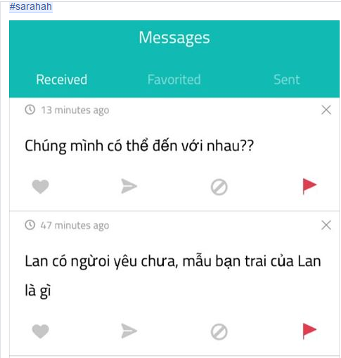Sarahah ngập tràn trang facebook với sự nhập cuộc đầy hào hứng của các bạn trẻ. Từ đây rất nhiều câu hỏi thầm kín không thể thẳng thắn đối thoại với nhau được có cơ hội “gửi thư” tới đối tượng trong “tầm ngắm”. Ứng dụng này còn cho phép người đặt câu hỏi không cần tạo tài khoản, chỉ việc click vào link và hỏi, rất phù hợp cho những ai chỉ thích đi hỏi mà không muốn người khác… hỏi lại.