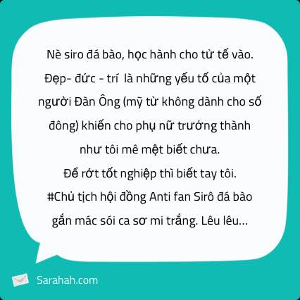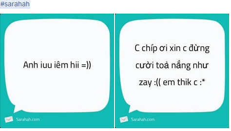 #Thính ngày xưa là những câu nói không đầu không cuối, không chủ đích và “thả” bâng quơ. Từ ngày có ứng dụng Sarahah, “thính” được chuyển tới đúng người, đúng thời điểm lại biết ngay kết quả. Muốn “thả thính” chuyên nghiệp hãy sử dụng Sarahah.