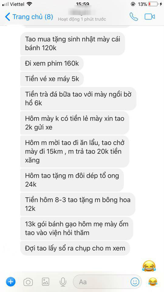 Bỗng một ngày đẹp trời, người yêu cũ nhắn tin cho cô bạn và liệt kê ra toàn những thứ nhỏ nhặt từ cốc nước mía, cốc trà đá bờ hồ hay thậm chí sự đón đưa lúc còn yêu thương cũng được quy đổi thành tiền… xăng. Để làm gì ư? Tất nhiên là đòi tình phí. Nếu cô bạn nợ nần thì đã đành đây lại toàn chi phí hẹn hò lúc còn mặn nồng.