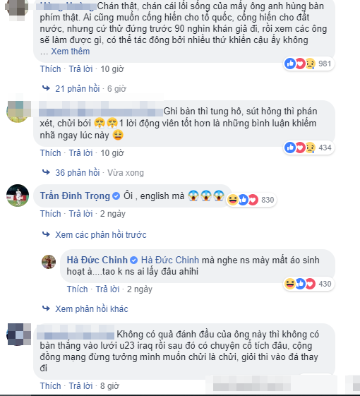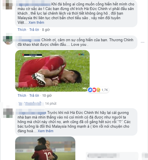Bên cạnh đó, nhiều người hâm mộ đã lên tiếng bảo vệ Đức Chinh. Theo họ, cầu thủ nào đã lên sân cũng vậy, đều chiến đấu hết mình vì màu cờ sắc áo, vì CĐV và không ai muốn bỏ lỡ cơ hội ghi bàn. Thêm nữa, việc vào facebook cá nhân của các cầu thủ để “làm loạn” như này sẽ làm ảnh hưởng không tốt tới tâm lý của họ trong khi chúng ta còn trận chiến nữa vào ngày 15 sắp tới.