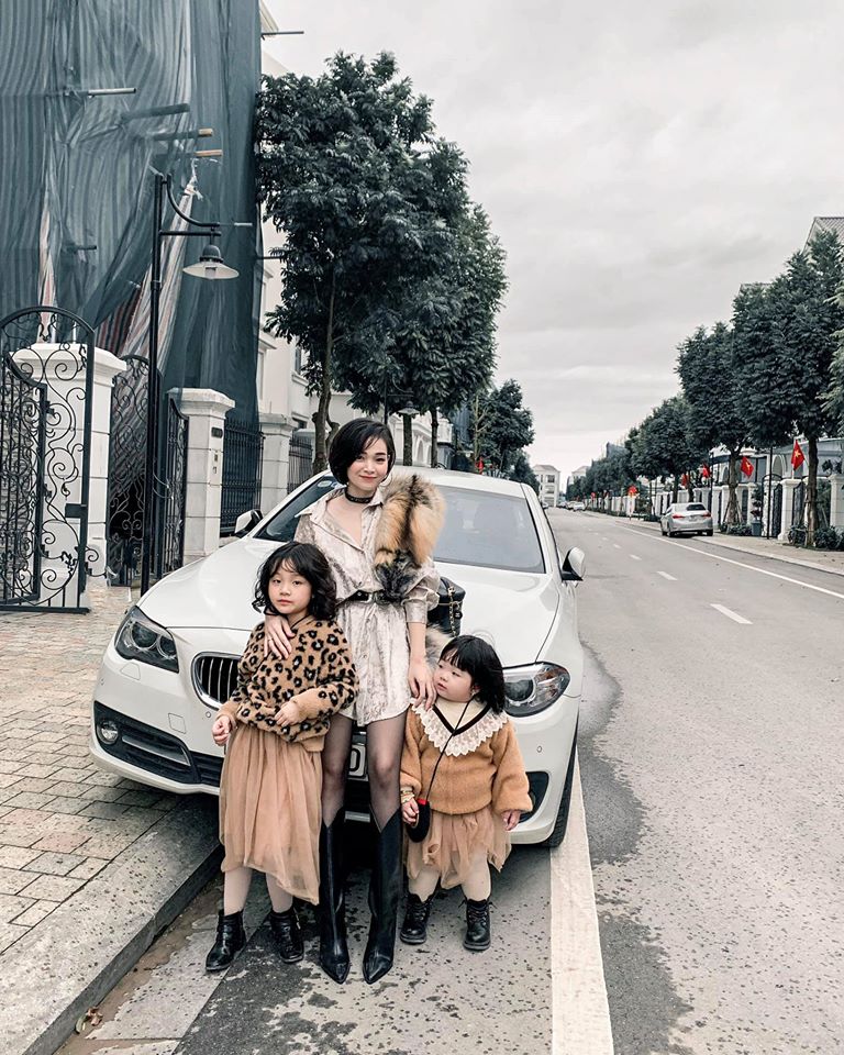3 mẹ con Ngọc Moon tạo dáng trước căn nhà mới.