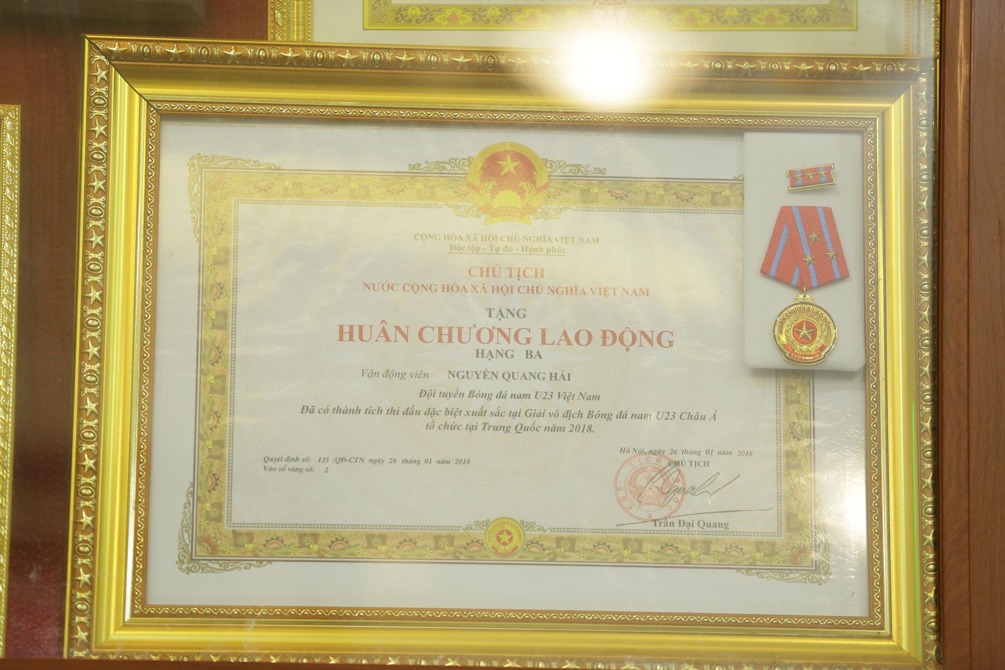 Quang Hải còn nhận được huân chương lao động hạng 3 do chủ tịch nước trao tặng