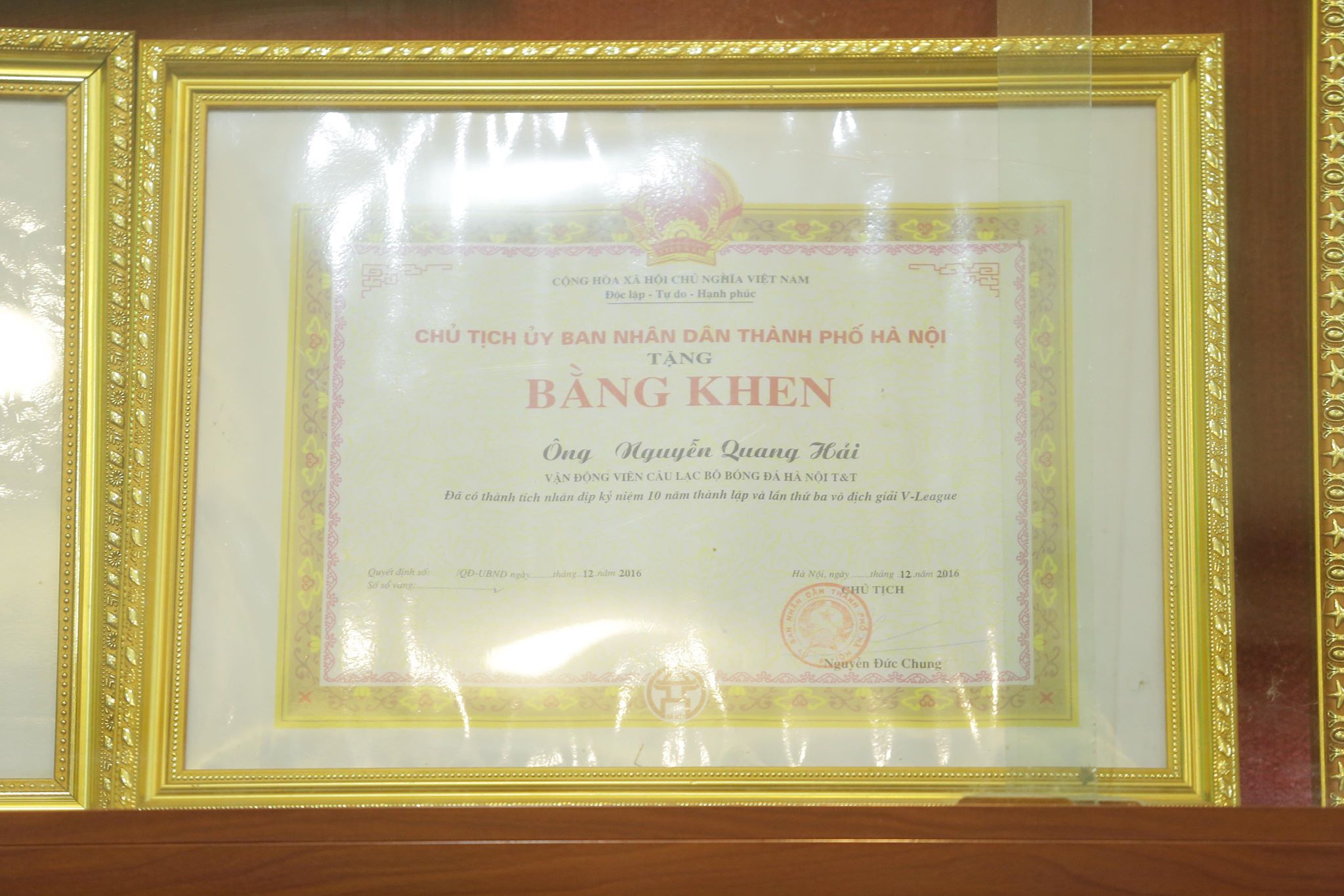 Một tấm bằng khen nữa được ủy ban nhân dân trao tặng cho Quang Hải