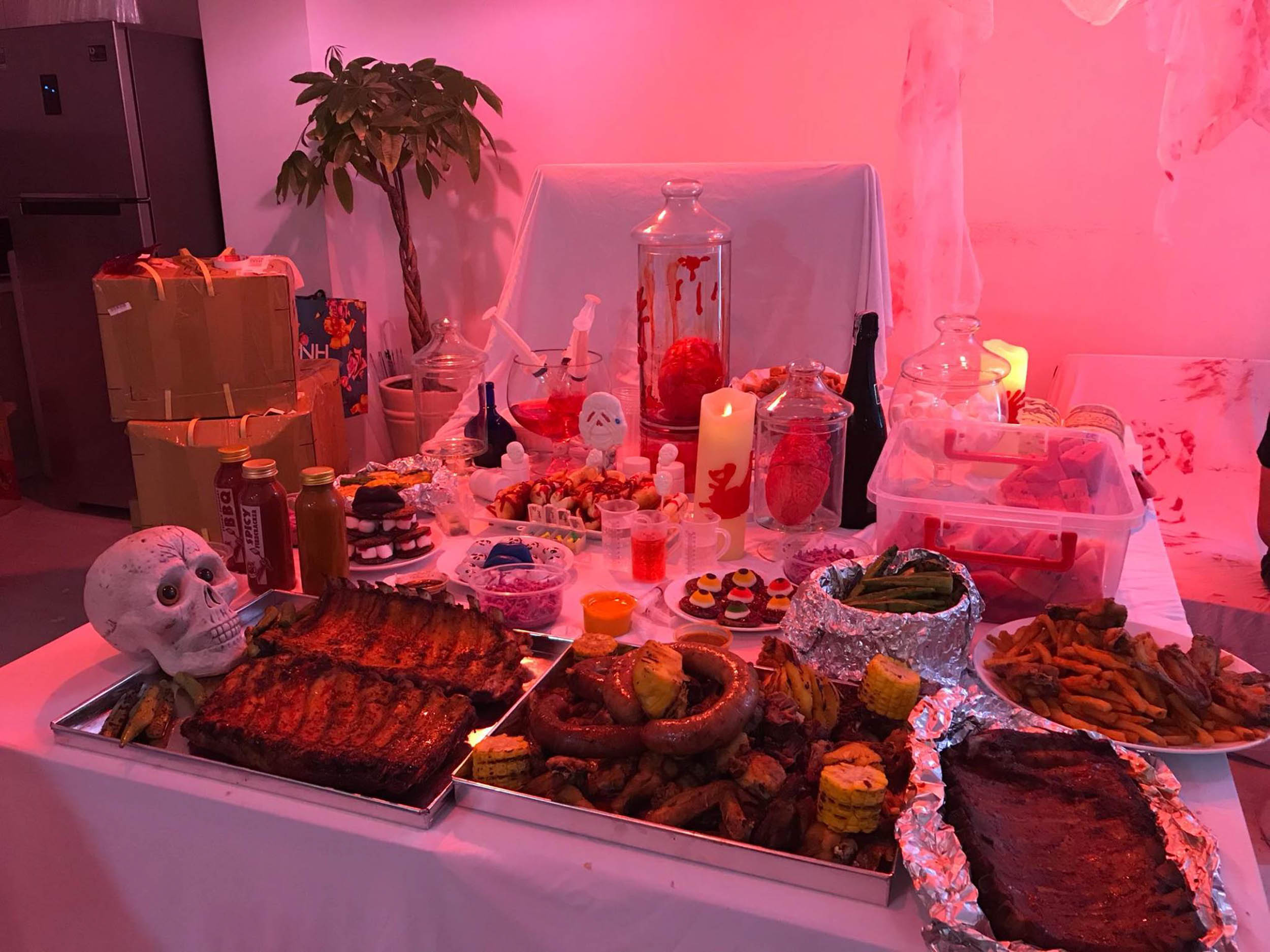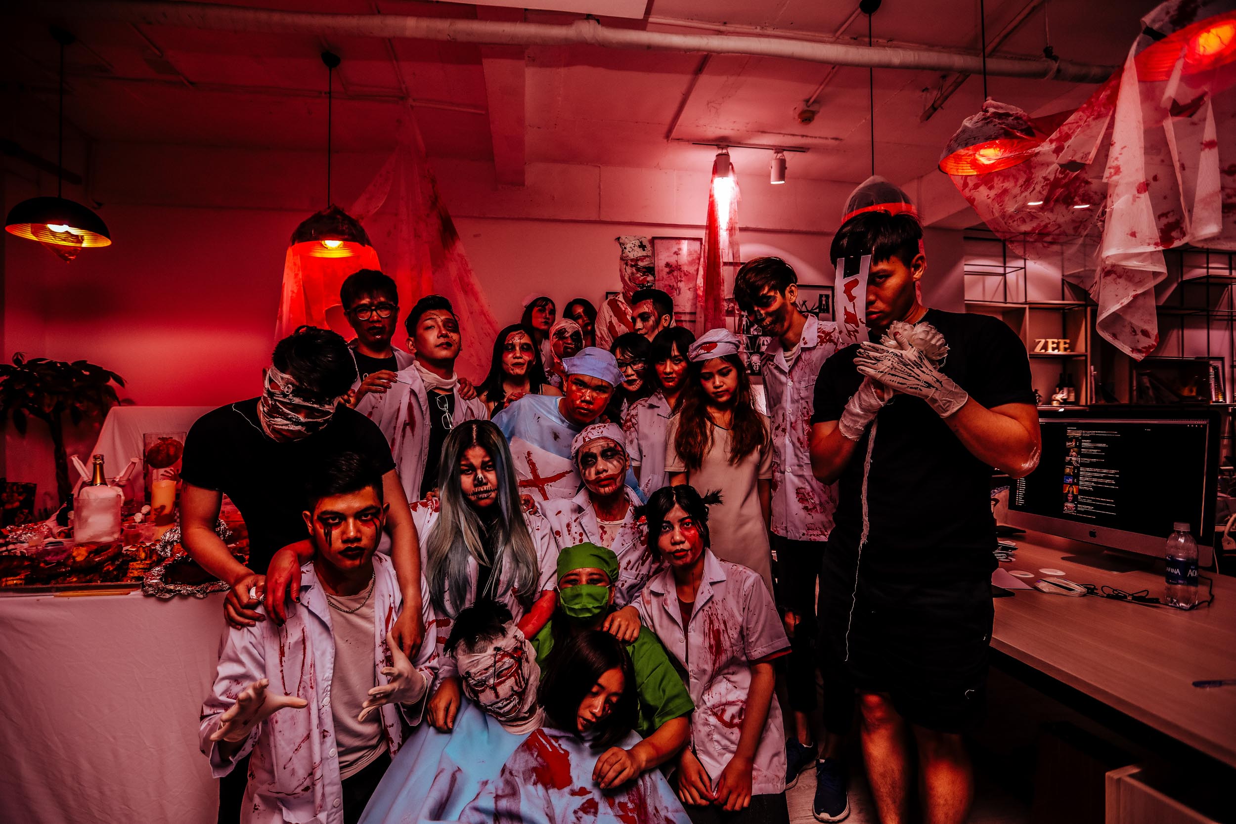 Toàn bộ không gian hơn 100m2 được trang trí thành một bệnh viện ma thứ thiệt với dàn bác sĩ, y tá ăn mặc, make-up theo phong cách kinh dị. Từ nhà vệ sinh cho đến phòng họp đều được phủ những chiếc khăn và dấu tay đầy máu… Cả bàn tiệc cũng được bày biện bởi những món ăn có hình dạng của mắt, miệng, quả tim, ngón tay,…