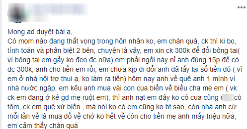 Nguyên văn câu chuyện như sau: “Có ai đang thất vọng trong cuộc sống hôn nhân không? Mình chán quá, chồng ki bo, tính toán và phân biệt giữa 2 bên.