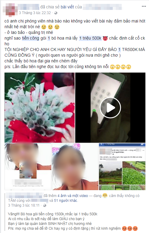 “Chồng em nuôi heo được 50 triệu để tặng sinh nhật vợ. Anh thuê quấn tiền lại trên chiếc đũa thành hoa mà con bé làm hộ lấy của chồng em hết 1.500k tiền công. Thôi thì chồng em lỡ dại một lần, nhân đây em cũng cảnh tỉnh các chị em, nhắc nhở cánh mày râu biết. Lần sau tặng tiền cứ bỏ nguyên xấp là được rồi. À chỗ em nông thôn tỉnh lẻ, mới sinh ra là quen nhau hết rồi, ra đường là chạm mặt nhau. Quán hoa của bé làm hộ này quen biết với vợ chồng em từ lúc mới sinh ra. Chỗ nông thôn của em 1500k là lớn lắm, còn ở thành phố thì em không biết như nào”.