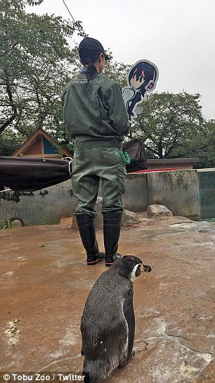 Không chỉ say mê nhan sắc của nàng Hululu, chú chim cánh cụt già này còn tỏ rõ thái độ khi nhân viên mang tấm bìa vào kho do sợ mưa bão. Lúc đó, chú ta lẽo đẽo đi đằng sau yêu cầu trả lại người tình cho mình.