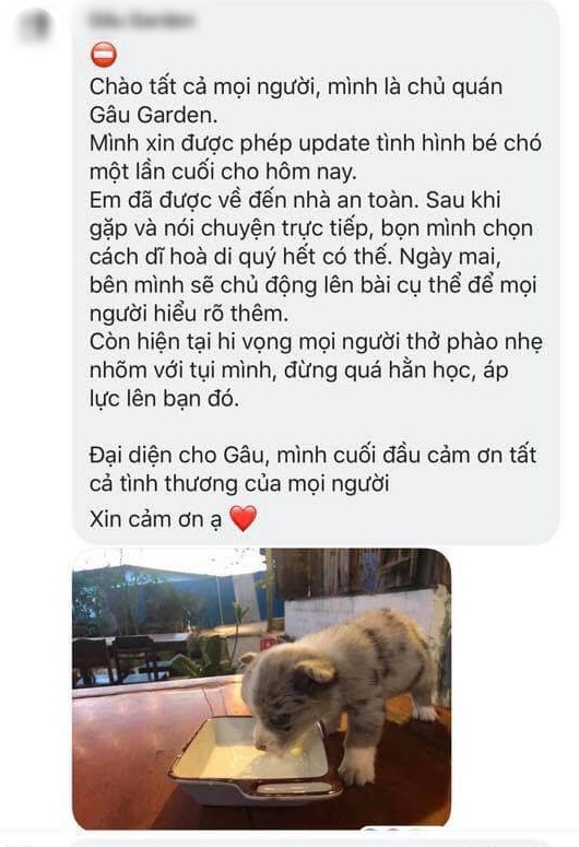 Bên cạnh đó, đại diện quán muốn gửi lời cảm ơn đến những người đã quan tâm đến câu chuyện và giúp đỡ đưa chó con trở về. Còn riêng sức khoẻ của bé chó nhỏ, chủ quán cũng chia sẻ: “khi trở về vì quá mệt, sợ nhưng em bú ngoan và đã đi ngủ”.