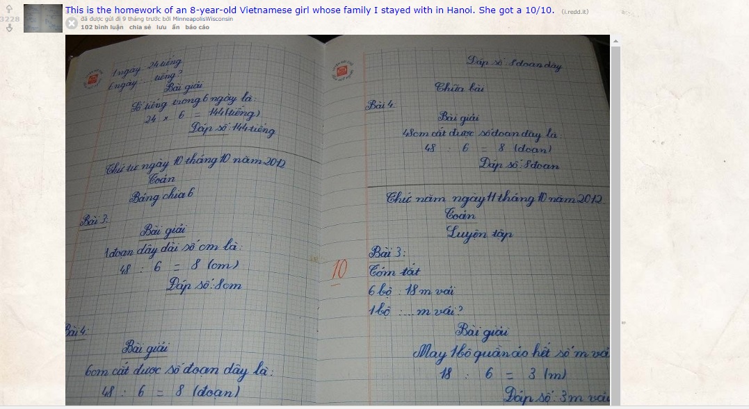 Người dùng này đã viết: ”This is the homework of an 8-year-old Vietnamese girl whose family I stayed with in Hanoi'' (Đây là bài tập về nhà của một cô bé 8 tuổi người Việt Nam, trong gia đình mà tôi đang ở cùng tại Hà Nội). Đi kèm là bức ảnh trang vở với nét chữ rất đẹp, ngay ngắn và sạch sẽ.