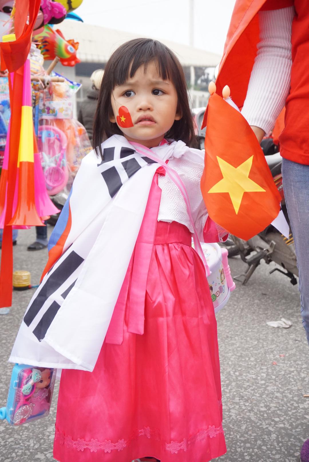 Cổ động viên nhí mình khoác cờ Hàn Quốc, tay cầm cờ đỏ sao vàng
