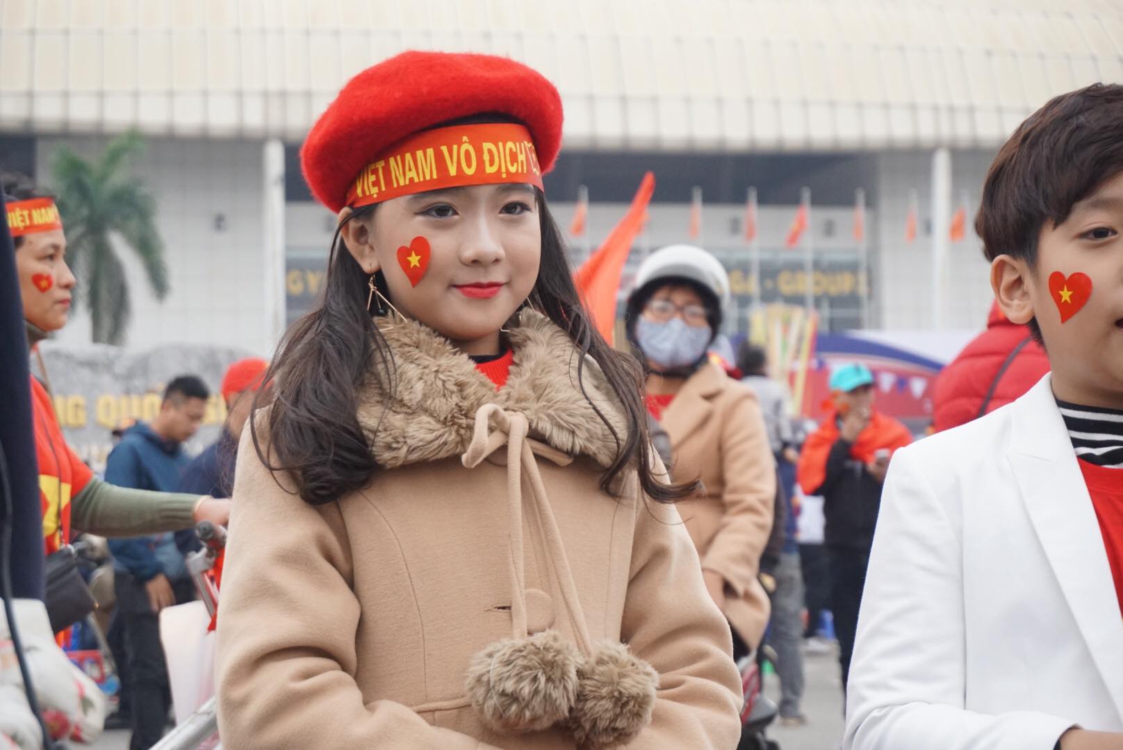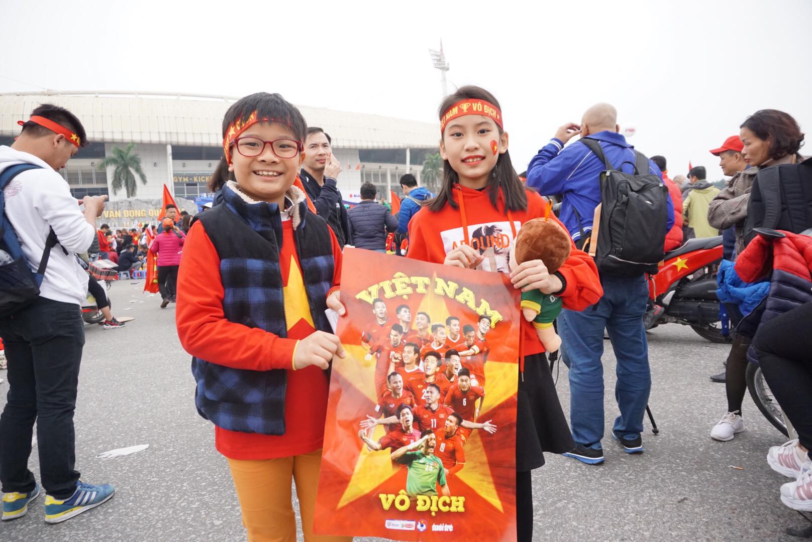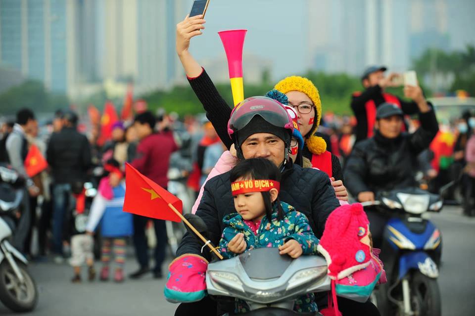 Niềm vui không chỉ đối với những người yêu bóng đá mà còn lan toả đến cả những cổ động viên nhí. Hình ảnh những cổ động viên nhí ôm cúp vàng, đầu đeo băng rôn và sticker cờ đỏ sao vàng dán hai bên má, cùng hoà chung không khí rộn ràng khắp các nẻo đường gây chú ý bởi sự đáng yêu và tinh thần