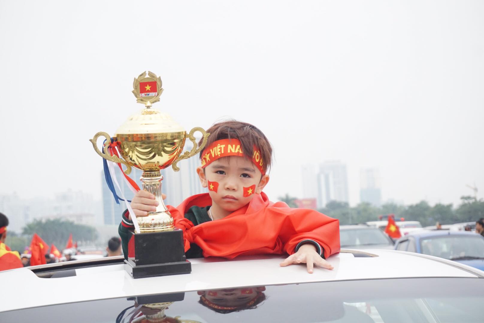 Cậu bé CĐV ôm cúp vàng nổi bật giữa đường phố