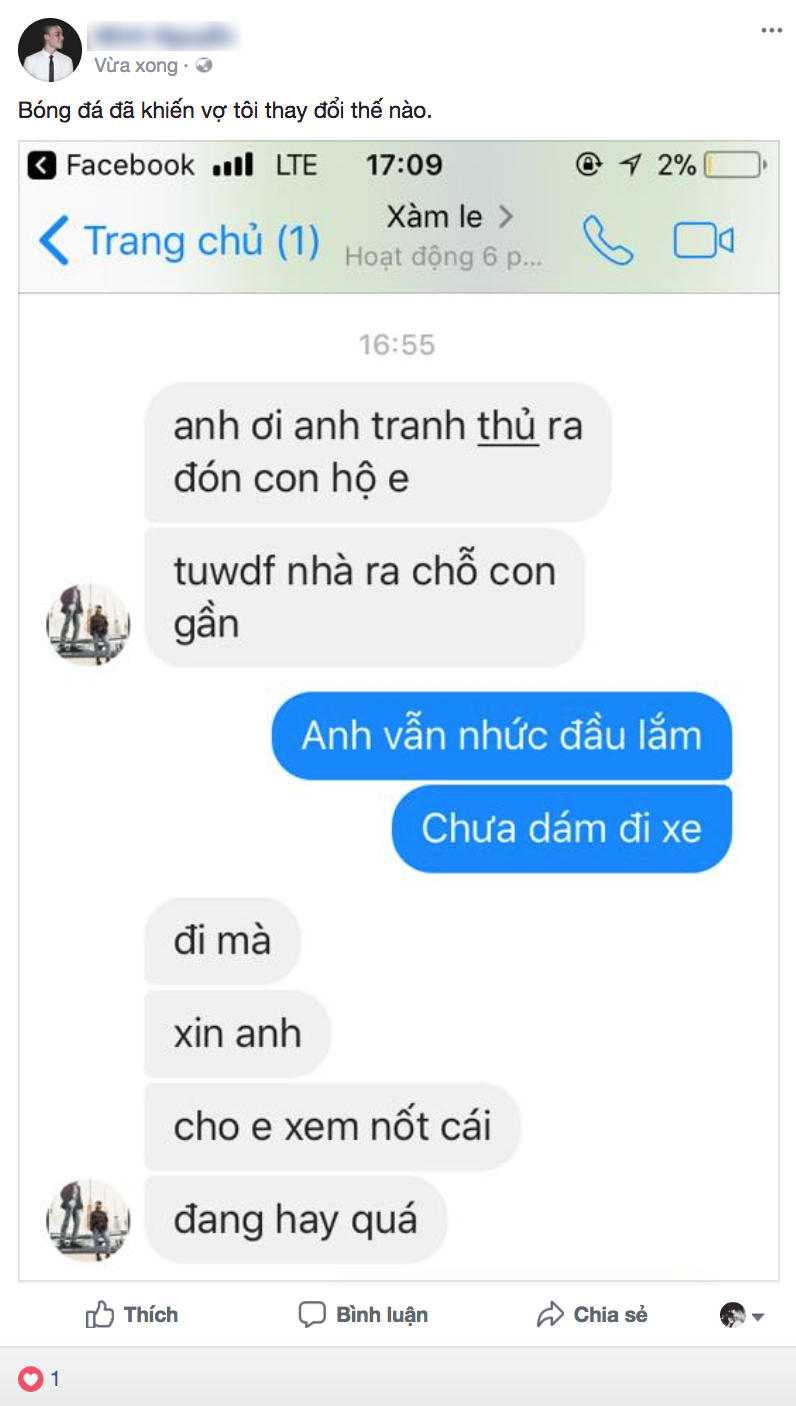 Một người vợ mải cổ vũ bóng đã nhờ chồng đón con hộ.