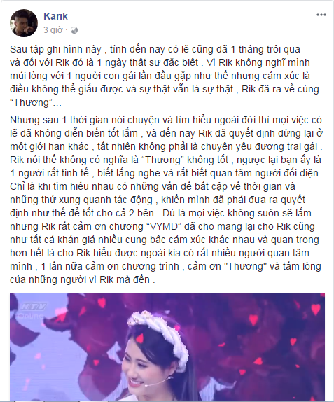 Chỉ là khi tìm hiểu nhau có những vấn đề bất cập về thời gian và những thứ xung quanh tác động, khiến mình đã phải đưa ra quyết định như thế để tốt cho cả 2 bên. Dù là mọi việc không suôn sẻ lắm nhưng Rik rất cảm ơn chương trình “Vì yêu mà đến” đã mang lại cho Rik cũng như tất cả khán giả nhiều cung bậc cảm xúc khác nhau, và quan trọng hơn hết là cho Rik hiểu được ngoài kia có rất nhiều người quan tâm mình, 1 lần nữa cảm ơn chương trình, cảm ơn Thương và tấm lòng của những người vì Rik mà đến”.
