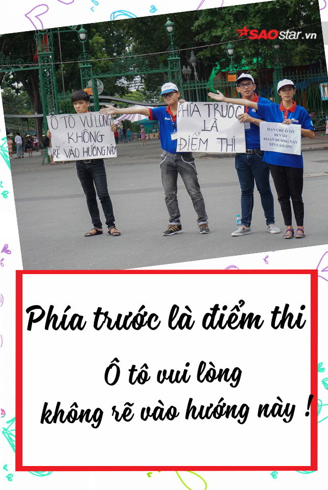 Để tránh tình trạng ùn tắc giao thông, tại một số điểm thi trên địa bàn TP. HCM, các bạn tình nguyện viên đã tự tay vẽ những tấm bảng hiệu để điều phối giao thông. Những bảng hiệu không có gì đặc biệt, chỉ là một tờ giấy trắng, dòng chữ viết tay hoặc in và trang trí bằng một vài kí hiệu nhỏ.