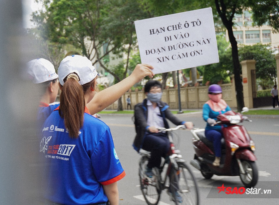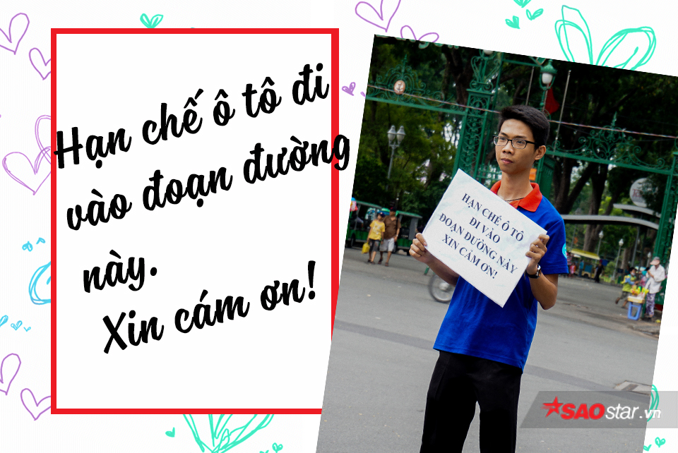 Khoảng 13g hôm nay, nhóm tình nguyện viên tại điểm thi trường THPT Trưng Vương (đường Nguyễn Bỉnh Khiêm, Q.1) đã đứng thành một hàng tại giao điểm ngã ba đường Lê Duẩn và Nguyễn Bỉnh Khiêm. Bất chấp thời tiết buổi trưa oi bức, mỗi bạn tình nguyện viên cầm trên tay một bảng hiệu với nội dung: “Ô tô vui lòng không rẻ vào hướng này”; “Phía trước là điểm thi”; “Hạn chế ô tô vào đoạn đường này. Xin cám ơn!”.